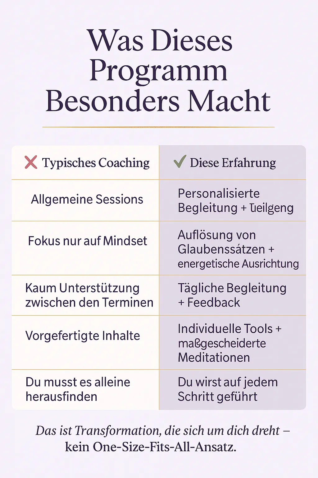 Das hier ist kein „nur Coaching“. Es ist eine persönliche, energetische und tiefgehende Heilungs- und Transformationsreise.
