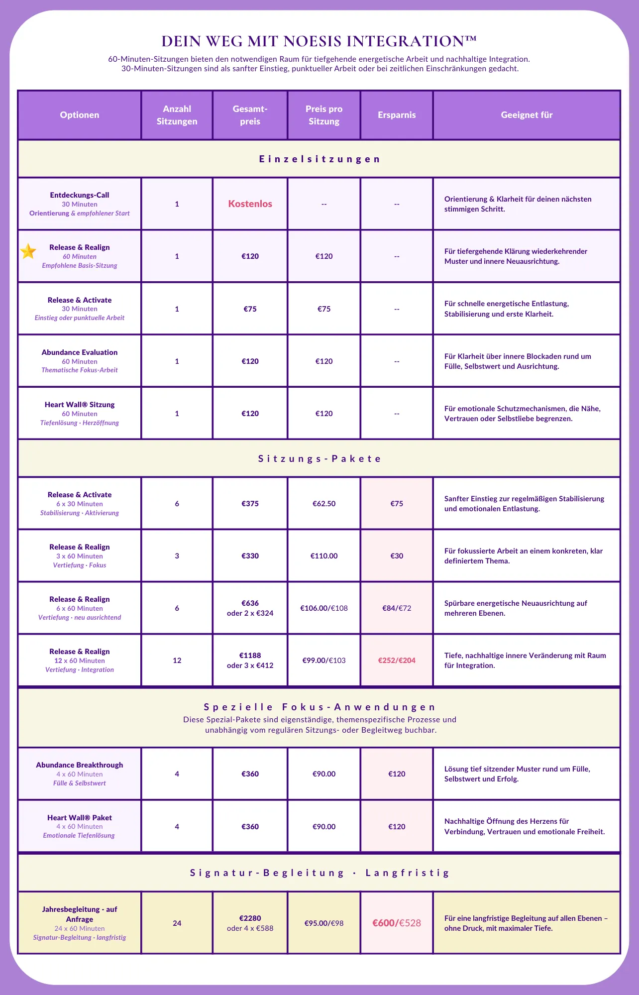Du erhältst einen ersten Einblick in meine Noesis Integration™ Methode und eine klare Empfehlung, welche Sitzung oder welches Programm dich jetzt optimal weiterträgt.